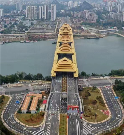 由中铁上海局五公司承建的柳州凤凰岭大桥项目,是目前国内跨径最大的钢-混凝土组合梁桥,同时也是世界上跨径最大、体量最大的跨江风雨桥。钢箱梁顶推施工是该桥最为关键的技术施工,全长690.9米,共设计55个节段,采用最大顶推跨度130米的步履式顶推施工方案。受本身结构设计特点影响,主桥钢箱梁施工难度极大,主要体现在:一是130米大跨度顶推施工,极易造成钢箱梁悬臂端下挠过大、悬臂根部应力集中,将会对钢箱梁结构产生极大的安全和质量隐患。二是钢箱梁顶板为开口设计,钢箱梁本身刚度相对较小,稳定性较差,施工受力复杂。三是钢箱梁设计线型为“圆曲线+直线+圆曲线+直线+圆曲线”的五段线,节段制作拼接精度要求高,顶推过程中线型控制难度大,需时刻调整线型,才能保证成桥线型的准确、美观。